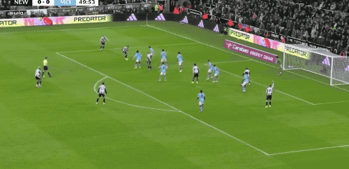 下半场开始仅仅4分钟,阿克45度传中,皮球打在戈登的两腿之间,差点造成纽卡10号的自摆乌龙。